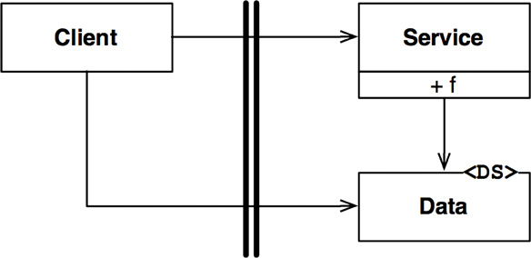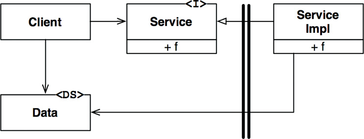 In Figure 18.1, the flow of control crosses the boundary from left to right. The Client calls function f() on the Service. It passes along an instance of Data. The <DS> marker simply indicates a data structure. The Data may be passed as a function argument or by some other more elaborate means. Note that the definition of the Data is on the called side of the boundary.