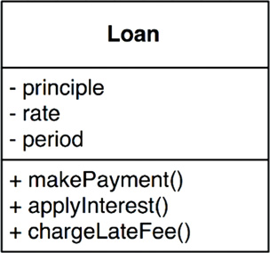 For example, Figure 20.1 shows what our Loan entity might look like as a class in UML. It has three pieces of Critical Business Data, and presents three related Critical Business Rules at its interface.