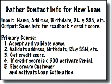 Figure 20.2 shows an example of a use case. Notice that in the last line it mentions the Customer. This is a reference to the Customer entity, which contains the Critical Business Rules that govern the relationship between the bank and its customers.