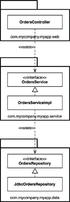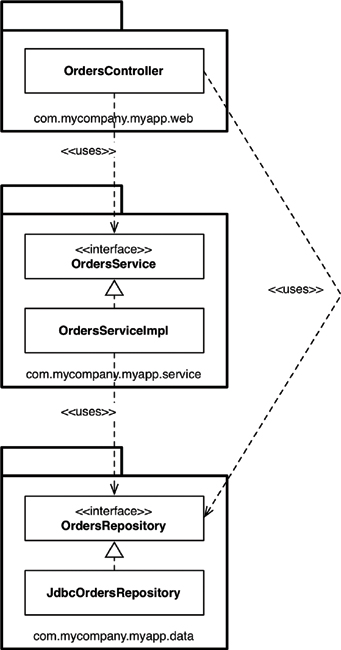 Suppose that you hire someone new who joins your team, and you give the newcomer another orders-related use case to implement. Since the person is new, he wants to make a big impression and get this use case implemented as quickly as possible. After sitting down with a cup of coffee for a few minutes, the newcomer discovers an existing OrdersController class, so he decides that’s where the code for the new orders-related web page should go. But it needs some orders data from the database. The newcomer has an epiphany: “Oh, there’s an OrdersRepository interface already built, too. I can simply dependency-inject the implementation into my controller. Perfect!” After a few more minutes of hacking, the web page is working. But the resulting UML diagram looks like Figure 34.5.