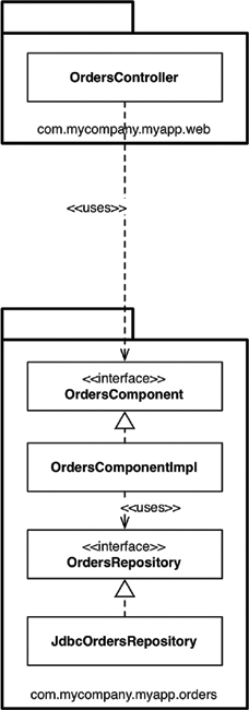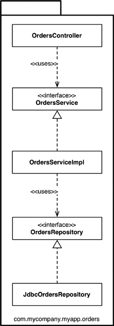 With this approach, as shown in Figure 34.2, we have the same interfaces and classes as before, but they are all placed into a single Java package rather than being split among three packages. This is a very simple refactoring from the “package by layer” style, but the top-level organization of the code now screams something about the business domain. We can now see that this code base has something to do with orders rather than the web, services, and repositories. Another benefit is that it’s potentially easier to find all of the code that you need to modify in the event that the “view orders” use case changes. It’s all sitting in a single Java package rather than being spread out.3