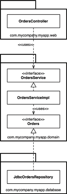 The com.mycompany.myapp.domain package here is the “inside,” and the other packages are the “outside.” Notice how the dependencies flow toward the “inside.” The keen-eyed reader will notice that the OrdersRepository from previous diagrams has been renamed to simply be Orders. This comes from the world of domain-driven design, where the advice is that the naming of everything on the “inside” should be stated in terms of the “ubiquitous domain language.” To put that another way, we talk about “orders” when we’re having a discussion about the domain, not the “orders repository.”