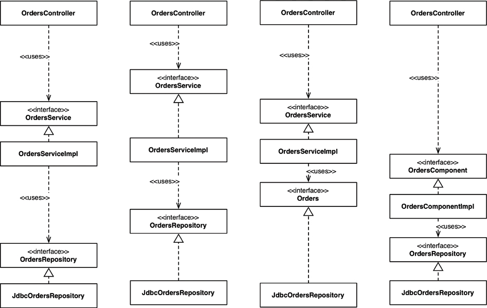 Moving from left to right, in the “package by layer” approach, the OrdersService and OrdersRepository interfaces need to be public, because they have inbound dependencies from classes outside of their defining package. In contrast, the implementation classes (OrdersServiceImpl and JdbcOrdersRepository) can be made more restrictive (package protected). Nobody needs to know about them; they are an implementation detail.
