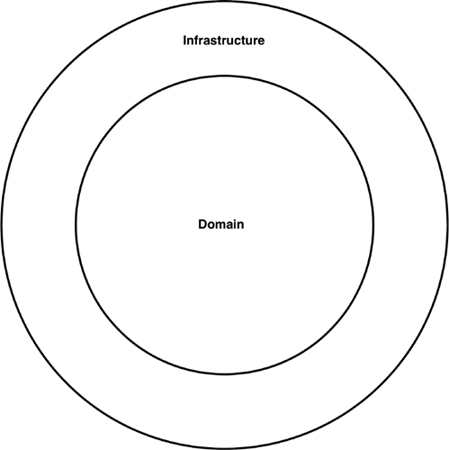 As Uncle Bob has said, approaches such as “ports and adapters,” the “hexagonal architecture,” “boundaries, controllers, entities,” and so on aim to create architectures where business/domain-focused code is independent and separate from the technical implementation details such as frameworks and databases. To summarize, you often see such code bases being composed of an “inside” (domain) and an “outside” (infrastructure), as suggested in Figure 34.3.