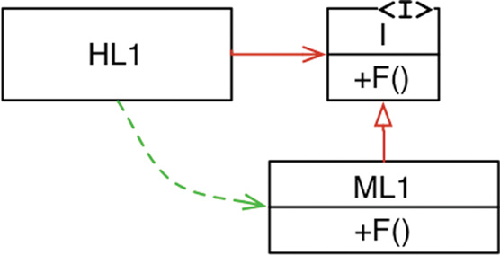 Note, however, that the source code dependency (the inheritance relationship) between ML1 and the interface I points in the opposite direction compared to the flow of control. This is called dependency inversion, and its implications for the software architect are profound.