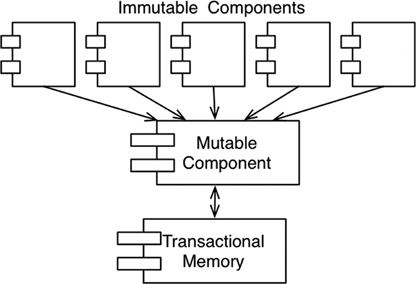 One of the most common compromises in regard to immutability is to segregate the application, or the services within the application, into mutable and immutable components. The immutable components perform their tasks in a purely functional way, without using any mutable variables. The immutable components communicate with one or more other components that are not purely functional, and allow for the state of variables to be mutated (Figure 6.1).